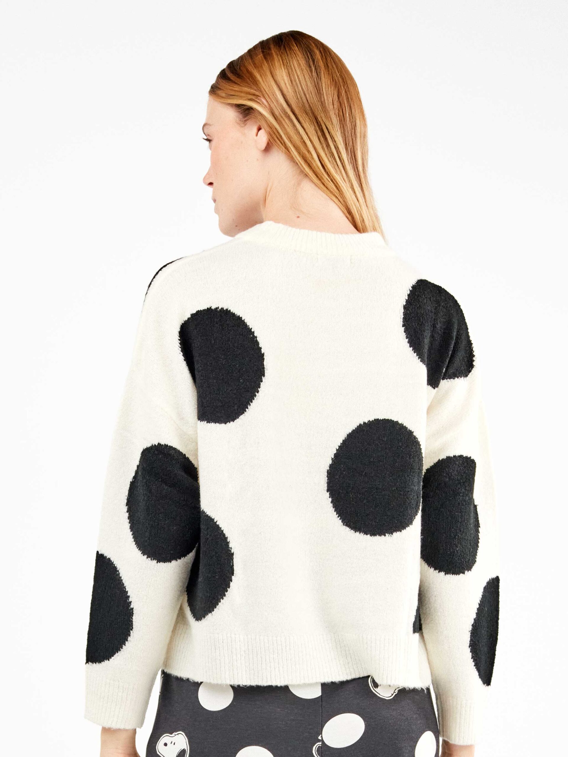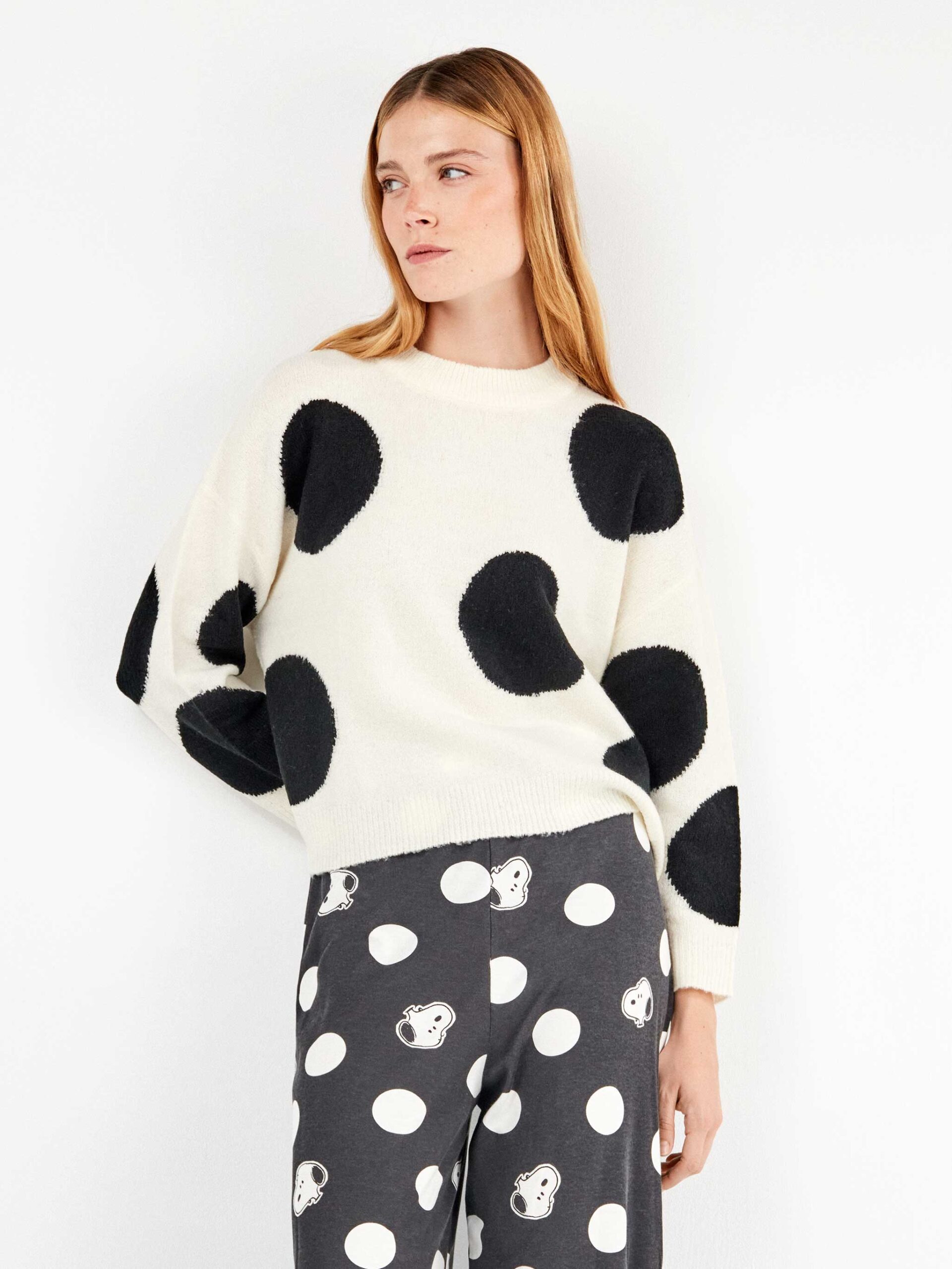 Jersey en tejido tricot de corte ancho con diseño de maxitopos en blanco y negro. Confeccionado en tejido suave y cálido. Tanto para disfrutarlo en casa o en tus looks de invierno.